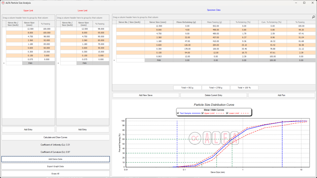 ALFA’s advanced software offers a straightforward and efficient solution for plotting particle size distribution curves. Key features include: